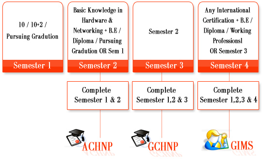 This program covers entire IT-Infrastructure Management Services domain. It is a 2 year program, comprising 4 semesters, where 6 months per sem. Eligibility to do this program (sem by sem) is given below. Students can do this program by spending 2 hrs per day (M-F) or 2 hrs per day (M,F,Weekends). This program can prove immense benefit to +2 students (who enters to his / her graduation), where in he/she can get high edge over others during their interview at final year and can come out of the college with flying colours.